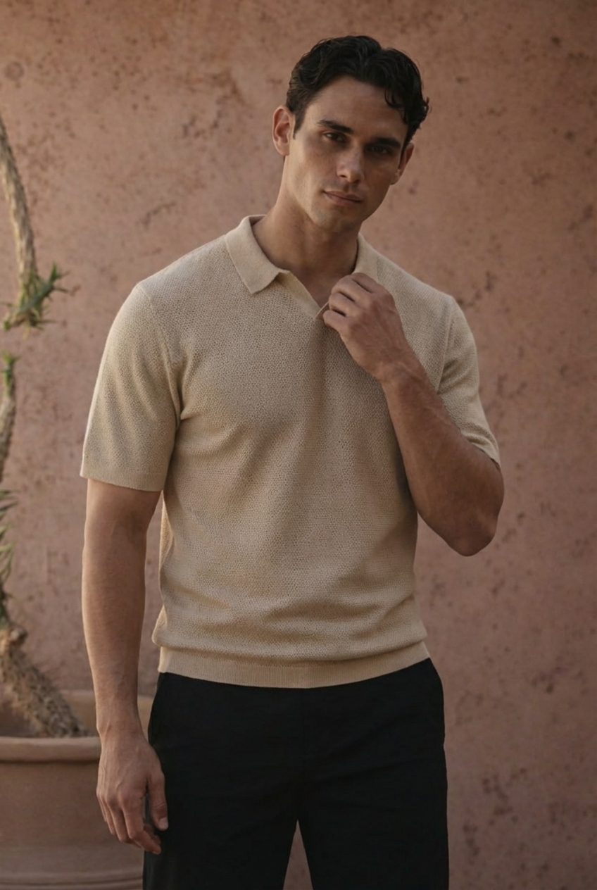 Un polo de punto fino con un estilo depurado y moderno. Su corte entallado realza la silueta, mientras que el cuello sin botones refuerza su elegancia discreta. Ligero, texturizado y fácil de llevar en cualquier temporada.